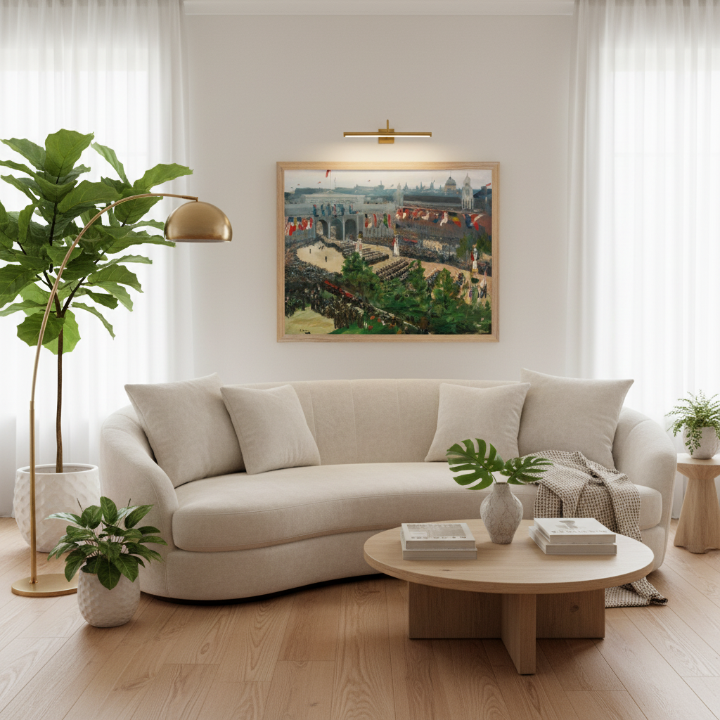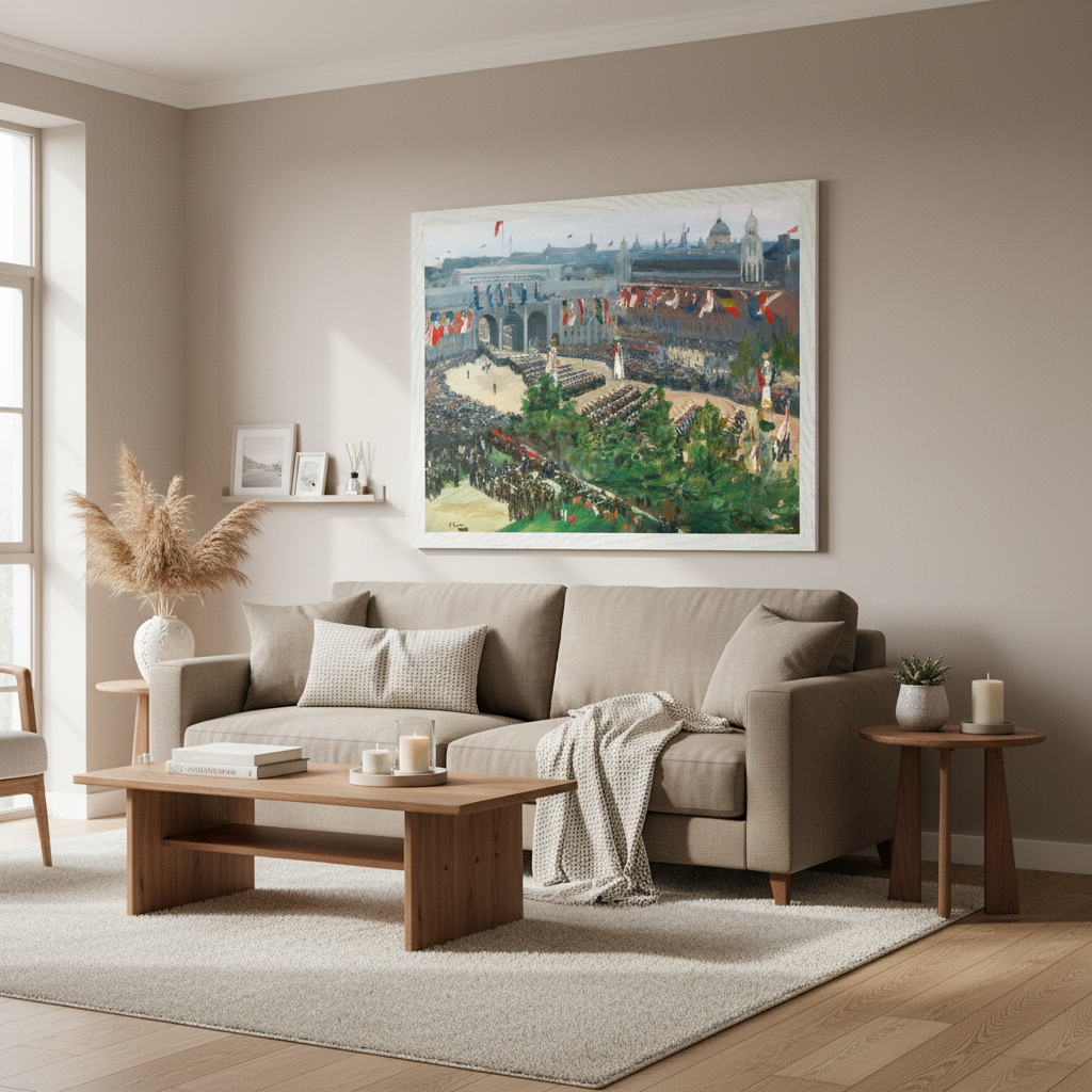 Dieses Werk, gemalt von Laverys Aussichtspunkt auf der Carlton House Terrace, bietet eine einzigartige Perspektive auf den von Militärgrößen wie Feldmarschall Haig und Marschall Foch angeführten Zug. Die leuchtenden Farben, die dynamische Komposition und die Liebe zum Detail erwecken die Aufregung und Feierlichkeit der Parade zum Leben. Das Kunstwerk ist ein Zeugnis des Endes eines zermürbenden Konflikts, eine Hommage an diejenigen, die gedient haben, und eine Erinnerung an einen bedeutsamen Tag in der Geschichte.