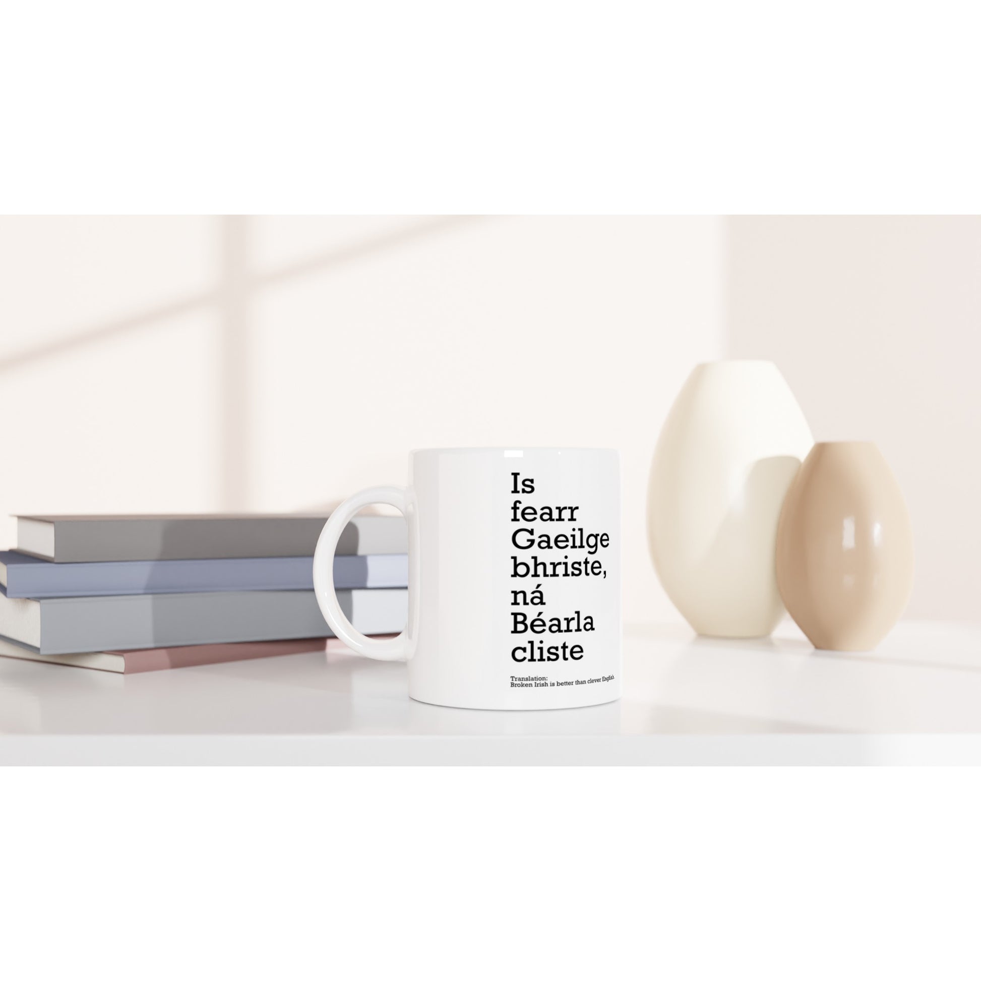 Umfassen Sie die Weisheit der Alten mit unserem Keramikbecher „Isfurther Gaeilge bhriste, ná Béarla cliste“, verziert mit einem irischen Sprichwort, das im Laufe der Jahrhunderte nachhallt. Dieses tiefgründige Sprichwort lässt sich mit „Broken Irish is better than clever English“ übersetzen und erinnert uns an den bleibenden Wert unserer Muttersprache.