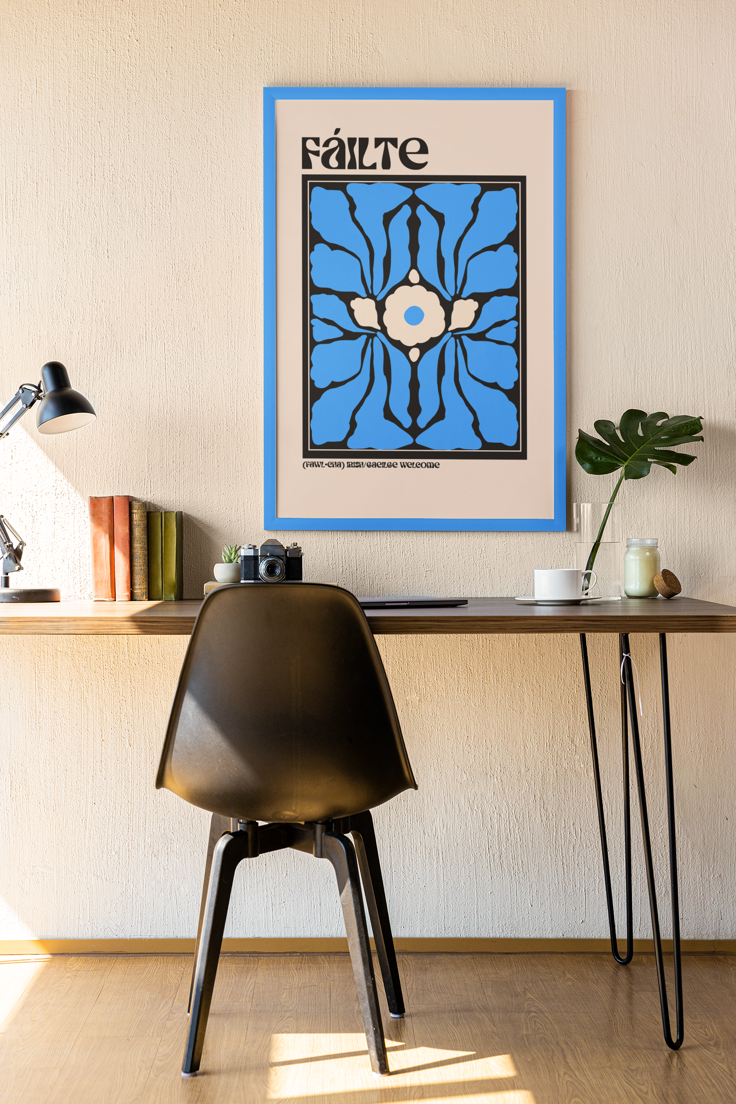Schaffen Sie eine einladende und warme Atmosphäre mit dem Kunstdruck „Fáilte“ , der das irische Wort für „Willkommen“ zeigt. Mit einem eleganten blau-schwarzen Blumenmuster verziert, verkörpert dieses Stück Gastfreundschaft, Freundlichkeit und den Geist der irischen Kultur.